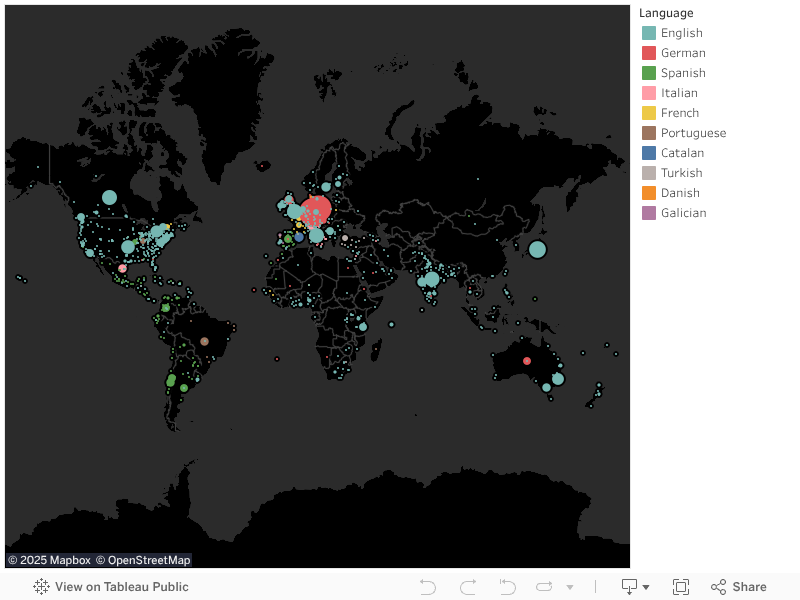 Click on each language in the legend to show the geographic locations of tweets (written in that language).